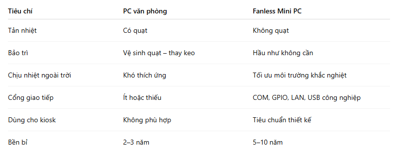 Tối Ưu Chi Phí & Giảm Hỏng Hóc Hệ Thống tại Khu Du Lịch với Fanless Mini PC Chuẩn Công Nghiệp View Larger Image Khi nhu cầu trải nghiệm dịch vụ tại các khu du lịch ngày càng nâng cao, việc áp dụng công nghệ vào vận hành hệ thống soát vé, bán vé và tự động hóa đang trở thành xu hướng tất yếu. Tuy nhiên, các thiết bị công nghệ dạng PC thông thường thường gặp nhiều vấn đề khi vận hành trong môi trường thực tế tại công viên giải trí và khu du lịch như Đầm Sen, Suối Tiên, Bà Nà Hills, VinWonders, Safari hay các khu tổ hợp vui chơi ngoài trời. Những vấn đề phổ biến có thể kể đến bao gồm bụi bẩn bám vào quạt tản nhiệt, độ ẩm cao làm oxy hoá linh kiện, nguồn điện dao động gây treo máy, hoặc quá nhiệt dẫn đến cháy nguồn và hư phần cứng. I. Fanless Mini PC là gì và tại sao phù hợp cho hệ thống kiosk & soát vé?Fanless Mini PC là dòng máy tính mini được thiết kế không sử dụng quạt tản nhiệt. Điều này giúp: ✔ không hút bụi✔ không phát tiếng ồn✔ không hỏng quạt✔ giảm chi phí bảo trì định kỳ Điểm nổi bật của sản phẩm nằm ở phần thân tản nhiệt dạng hợp kim nguyên khối: ► Khung nhôm dày tản nhiệt đa hướng Giúp CPU hoạt động ổn định trong môi trường tới 65–70°C ► Linh kiện chuẩn công nghiệp Sử dụng tụ rắn và IC chống nhiễu ► CPU Low Power Giảm nhiệt sinh ra giúp hệ thống đạt hiệu suất cao và bền bỉ hơn Đây chính là lý do Mini PC dạng fanless ngày càng thay thế PC văn phòng truyền thống. II. Sự khác biệt giữa Fanless Mini PC và máy tính truyền thốngKết luận: Máy tính văn phòng rẻ hơn ban đầu nhưng tổng chi phí vận hành (TCO) lại cao hơn nhiều. Trong khi đó Fanless Mini PC: ✔ đầu tư một lần✔ sử dụng bền✔ không gián đoạn vận hành Đặc biệt với khu du lịch, mỗi lần thiết bị dừng hoạt động = mất doanh thu trực tiếp. III. Vì sao khu du lịch & công viên cần Fanless Mini PC chuẩn công nghiệp?1. Môi trường vận hành khắc nghiệt Tại kiosk bán vé ngoài trời thường gặp: 🔥 nhiệt độ cao lên tới 45°C💧 độ ẩm > 75%🌧 hơi nước, hơi clo (khu hồ bơi)🌪 bụi gió và cát🔌 nguồn điện dao động do mạch tải lớn Fanless Mini PC được thiết kế: ✔ chống oxy hóa linh kiện✔ chống sốc tải điện✔ chống rung từ hệ thống cơ khí✔ chống ẩm nhờ lớp sơn bảo vệ mạch 2. Vận hành liên tục 24/7 Thời gian cao điểm du lịch: ⏱ từ 8h – 22h mỗi ngày⏱ các dịp lễ, tết có thể hoạt động non-stop Máy chạy liên tục trong tủ kiosk kín → máy văn phòng dễ: ❌ nóng máy❌ treo CPU❌ đứng ứng dụng❌ hư ổ cứng Fanless Mini PC dùng SSD NVMe chống shock giúp: ✔ không mất dữ liệu✔ khởi động 5–12 giây✔ không chạy nóng 3. Hỗ trợ hệ thống thiết bị bán vé & soát vé hiệu quả hơn Các thiết bị đi kèm: ➡ Máy in bill vé➡ Máy quét mã QR➡ Hệ thống RFID/Thẻ từ➡ Cảm biến cổng xoay➡ POS thanh toán QR Fanless Mini PC hỗ trợ: ⭐ RS232 kết nối trực tiếp scanner⭐ LAN kép kết nối đồng thời server & barrier⭐ USB công nghiệp chống nhiễu⭐ GPIO điều khiển đóng – mở cổng xoay Điều mà PC dân dụng gần như không đáp ứng. IV. Các tính năng nổi bật chuyên dụng cho kiosk và công viên★ Thiết kế không quạt chống bụi → Không có khe quạt hút→ Không tích bụi → không cần vệ sinh ★ Thiết kế nhỏ gọn Kích thước chỉ từ: 📌 110mm x 120mm x 40mm Lắp gọn sau màn hình kiosk mà không cần khoang chứa lớn. ★ Bộ nguồn Industrial Power Chống xung sét Tự bảo vệ quá tải Tự khởi động lại nếu mất điện đột ngột ★ Hoạt động ổn định trong mạng đông thiết bị Hỗ trợ VLAN DHCP nội bộ Nhiều thiết bị cắm kết nối mà không nghẽn ★ Tích hợp 4G – WiFi – LAN kép → Sử dụng khi server đặt xa→ Vận hành ngay cả khi mất internet tạm thời→ Đồng bộ dữ liệu sau khi có mạng ★ Tuổi thọ dài hạn Bo mạch PCB của Fanless Mini PC được xử lý trên chuẩn: ☑ Anti-corrosion coating☑ Anti-static protection☑ IO over-voltage protection Do đó tuổi thọ thiết bị cao hơn PC văn phòng từ 3–7 năm. V. Ứng dụng thực tế trong vận hành du lịch1. Khu du lịch phức hợp & công viên giải trí Fanless Mini PC phục vụ: 👉 Quầy đặt vé nhanh👉 Kiosk in vé tại chỗ👉 Quét vé bằng QR tại cổng👉 Máy POS tự phục vụ (Kết nối máy quét mã vạch không dây)👉 Cổng kiểm soát ra/vào tự động 2. Khu du lịch sinh thái, resort Ứng dụng: ✔ xác thực vé ngày✔ quản lý ra/vào phòng✔ quản lý vé dịch vụ combo 3. Trung tâm thương mại – công viên nước Ứng dụng: ✔ cổng xoay tích hợp RFID✔ quầy giữ đồ tự động✔ kiosk menu nhà hàng VI. Câu chuyện thực tế (Storytelling Case Study)Tình huống ban đầu tại một công viên lớn miền Nam Đầu năm 2024, hệ thống vé tự động tại khu công viên X triển khai 32 kiosk liên tục bị: ❌ treo ứng dụng POS❌ không nhận máy quét RFID❌ mất kết nối đến server❌ quạt máy kêu lớn và hỏng❌ hư 6 máy chỉ sau 90 ngày Chi phí mỗi lần bảo trì trung bình 1,200,000–1,800,000 VNĐ/kiosk. Khách xếp hàng dài vào cuối t