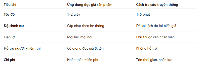Giải pháp tra cứu giá thông minh: Ứng dụng đọc giá & tên sản phẩm bằng giọng nói View Larger Image Giới thiệu: Khi công nghệ hỗ trợ trải nghiệm mua sắmTrong thời đại số, việc mua sắm không chỉ dừng lại ở việc chọn sản phẩm và thanh toán. Người tiêu dùng ngày càng mong muốn sự minh bạch, nhanh chóng và chính xác trong quá trình mua sắm. Đó chính là lý do ứng dụng đọc giá sản phẩm bằng giọng nói ra đời. Chỉ cần quét mã vạch, ứng dụng sẽ ngay lập tức hiển thị và đọc to giá bán kèm theo tên sản phẩm. Đây là một giải pháp công nghệ thông minh giúp mọi khách hàng tiết kiệm thời gian và an tâm hơn khi mua sắm. Tại sao nên sử dụng ứng dụng đọc giá sản phẩm bằng giọng nói? Chính xác tuyệt đối tại thời điểm quét Giá được cập nhật trực tiếp từ hệ thống dữ liệu. Loại bỏ tình trạng giá kệ và giá thanh toán không khớp. Nhanh chóng và tiện lợi Chỉ mất vài giây để biết giá bán. Có thể tra cứu nhiều sản phẩm liên tiếp mà không giới hạn. Minh bạch và rõ ràng Khách hàng tự kiểm chứng thông tin giá bán. Giúp xây dựng niềm tin với cửa hàng và siêu thị. Hỗ trợ đặc biệt cho người khiếm thị Ứng dụng phát loa đọc giá và tên sản phẩm. Mở ra cơ hội tiếp cận công bằng với thông tin sản phẩm. Ứng dụng hoạt động như thế nào?Ứng dụng này ứng dụng công nghệ nhận diện mã vạch và xử lý dữ liệu theo thời gian thực: 📱 Bước 1: Người dùng mở ứng dụng quét mã vạch trên smartphone hoặc máy tính bảng. 📷 Bước 2: Đưa mã vạch sản phẩm vào khung quét. ⏱️ Bước 3: Hệ thống truy xuất dữ liệu và trả về thông tin giá bán. 🔊 Bước 4: Ứng dụng đọc to giá bán và tên sản phẩm bằng giọng nói tự nhiên. 👉 Tất cả chỉ trong 1–2 giây, nhanh chóng và chính xác. Những tính năng nổi bật Tra cứu giá bán chuẩn xác tại thời điểm hiện tại. 🔊 Đọc giá và tên sản phẩm bằng giọng nói rõ ràng. 📦 Hỗ trợ đa dạng mã vạch (EAN, UPC, QR Code). ⚡ Quét nhanh và không giới hạn số lần. 🎁 Miễn phí sử dụng, dễ dàng tải về trên điện thoại. So sánh ứng dụng đọc giá bằng giọng nói với cách tra cứu truyền thốngAi nên sử dụng ứng dụng này? Người tiêu dùng mua sắm thường xuyên: kiểm tra giá nhanh chóng, chính xác. Người khiếm thị: dễ dàng tiếp cận thông tin sản phẩm. Doanh nghiệp bán lẻ: tăng trải nghiệm khách hàng, giảm tải công việc nhân viên. Siêu thị và cửa hàng tiện lợi: hỗ trợ mô hình tự phục vụ, minh bạch giá bán. Kết luận: Giải pháp công nghệ cho mua sắm hiện đạiỨng dụng đọc giá sản phẩm bằng giọng nói không chỉ mang đến sự tiện lợi và minh bạch, mà còn là công cụ hỗ trợ hữu ích cho mọi khách hàng. Với tốc độ nhanh, độ chính xác cao và khả năng hỗ trợ đặc biệt cho người khiếm thị, đây chắc chắn sẽ là ứng dụng đồng hành không thể thiếu trong kỷ nguyên mua sắm thông minh. 👉 Hãy tải ngay và trải nghiệm sự khác biệt! Hướng dẫn Download và sử dụngTài liệu HDSD.docxVideo hướng dẫnĐăng ký tài khoản miễn phí tại soundtag.optorobot.comDownload phần mềm Sound-Tag cho HĐH Windows Danh mục máy quét mã vạchDÒNG MÁY CÓ DÂYDÒNG MÁY KHÔNG DÂYDÒNG MÁY KIỂM KHO PDADÒNG MÁY FITMOUNT Bán Hàng POS – Bảng Giá Điện TửMáy quét mã vạchMáy kiểm khoElectronic Shelf Label admin2025-10-02T22:32:47+07:00 Related Posts Không cần hỏi nhân viên: Quét mã vạch để biết giá & sản phẩm ngay tức thì Không cần hỏi nhân viên: Quét mã vạch để biết giá & sản phẩm ngay tức thì Tháng 10 1st, 2025 Ứng dụng quét mã vạch hỗ trợ loa đọc giá – Nhanh, miễn phí, dễ sử dụng Ứng dụng quét mã vạch hỗ trợ loa đọc giá – Nhanh, miễn phí, dễ sử dụng Tháng 10 1st, 2025 Chỉ cần quét mã vạch – Ứng dụng sẽ đọc chính xác giá bán tại thời điểm hiện tại Chỉ cần quét mã vạch – Ứng dụng sẽ đọc chính xác giá bán tại thời điểm hiện tại Tháng 10 1st, 2025 Kiểm tra giá sản phẩm bằng mã vạch – Công cụ hữu ích cho mọi khách hàng Kiểm tra giá sản phẩm bằng mã vạch – Công cụ hữu ích cho mọi khách hàng Tháng 10 1st, 2025 Quét mã vạch – Tra cứu giá bán chính xác, nhanh chóng và tiện lợi Quét mã vạch – Tra cứu giá bán chính xác, nhanh chóng và tiện lợi Tháng 10 1st, 2025