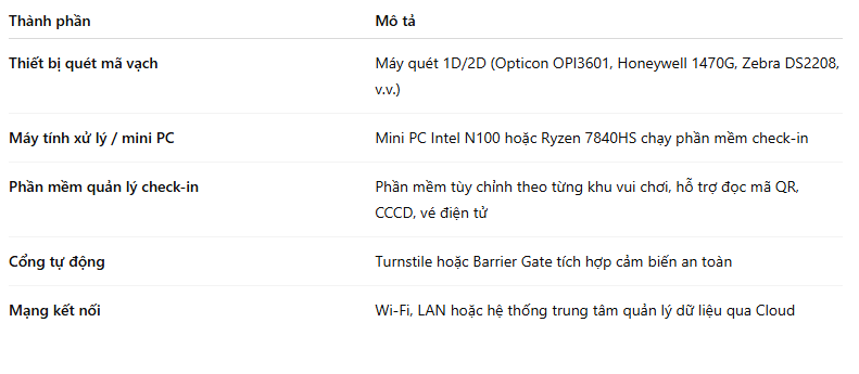 Hệ thống check-in khu vui chơi, công viên bằng mã vạch nhanh chóng View Larger Image 1. Giới thiệu xu hướng tự động hóa tại khu vui chơi & công viênTrong thời đại công nghệ số, các khu vui chơi, công viên, khu du lịch và trung tâm giải trí đang chuyển mình mạnh mẽ sang mô hình vận hành thông minh. Một trong những giải pháp được triển khai rộng rãi hiện nay là hệ thống check-in bằng mã vạch, giúp khách tham quan ra vào nhanh chóng, an toàn và chuyên nghiệp hơn bao giờ hết. Giải pháp này không chỉ rút ngắn thời gian xếp hàng, mà còn tự động hóa toàn bộ quy trình kiểm soát vé, thống kê lượt khách, và tích hợp thanh toán điện tử – mang lại trải nghiệm hiện đại, tiện lợi cho cả người dùng lẫn ban quản lý. 2. Hệ thống check-in bằng mã vạch là gì?Hệ thống check-in bằng mã vạch là một giải pháp công nghệ cho phép khách hàng quét mã QR hoặc mã vạch trên vé điện tử, thẻ thành viên hoặc giấy in để xác thực quyền ra vào. Toàn bộ quá trình này được xử lý tự động thông qua: Máy quét mã vạch (barcode scanner) hoặc camera AI; Phần mềm quản lý check-in kết nối với cơ sở dữ liệu; Cổng ra vào tự động (turnstile) hoặc hệ thống cửa kiểm soát (gate control system). Chỉ với thao tác đơn giản – đưa mã vé vào vùng quét, hệ thống sẽ xác thực thông tin, mở cổng và ghi nhận thời gian check-in chỉ trong 1–2 giây. 3. Cách thức hoạt động của hệ thống check-in bằng mã vạchMột hệ thống check-in hoàn chỉnh tại khu vui chơi hoặc công viên bao gồm ba thành phần chính: 🔹 1. Thiết bị quét mã vạch Các loại máy quét mã vạch cầm tay, máy quét cố định hoặc máy quét tích hợp cửa tự động (như Opticon, Honeywell, Zebra…) được sử dụng để đọc mã QR/mã vạch trên: Vé điện tử hiển thị trên điện thoại; Vé giấy in sẵn; Thẻ thành viên hoặc vòng tay RFID có in mã vạch. 🔹 2. Phần mềm quản lý check-in Phần mềm sẽ: Xác thực dữ liệu vé trong vài phần nghìn giây; Lưu lại lịch sử ra/vào từng lượt khách; Kiểm tra tính hợp lệ của vé (tránh trùng mã hoặc vé đã sử dụng); Kết nối với hệ thống POS, bán vé online hoặc ứng dụng di động. 🔹 3. Cổng ra vào tự động (Turnstile / Gate) Sau khi mã vạch được xác nhận, hệ thống điều khiển sẽ: Mở cổng tự động cho khách hợp lệ; Từ chối hoặc báo hiệu với nhân viên khi vé không hợp lệ; Đồng thời ghi lại dữ liệu thống kê cho bộ phận quản lý. 4. Lợi ích của hệ thống check-in bằng mã vạch trong khu vui chơi✅ Tốc độ xử lý vượt trội Mỗi lượt check-in chỉ mất 1–2 giây; Có thể xử lý hàng nghìn lượt khách mỗi giờ, giúp giảm tình trạng xếp hàng giờ cao điểm. ✅ Độ chính xác tuyệt đối Hệ thống tự động loại bỏ vé trùng, vé giả, hoặc vé đã quét trước đó; Dữ liệu được mã hóa và lưu trữ tập trung, tránh thất thoát. ✅ Giảm nhân sự và chi phí vận hành Không cần nhiều nhân viên soát vé thủ công; Tự động ghi nhận, thống kê, báo cáo doanh thu và lưu lượng khách ra/vào. ✅ Tích hợp linh hoạt với các hệ thống khác Kết nối trực tiếp với website bán vé, app di động, hoặc Zalo OA; Hỗ trợ xuất báo cáo thống kê chi tiết cho từng khung giờ, ngày, tuần, tháng. ✅ Trải nghiệm khách hàng hiện đại Khách chỉ cần mở mã QR trong điện thoại hoặc vé điện tử để vào cửa; Không cần in vé giấy – thân thiện với môi trường và tiện lợi. 5. Ứng dụng thực tế của hệ thống check-in bằng mã vạch🎡 1. Khu vui chơi – công viên giải trí Kiểm soát ra/vào tại các cổng chính, khu trò chơi, khu nhà ma, khu trượt nước… Quản lý vé ngày, vé combo, vé nhóm hoặc vé ưu đãi. 🏖️ 2. Khu du lịch – resort – công viên nước Kiểm soát khách mua vé online qua website hoặc ứng dụng. Kết hợp vòng tay có mã vạch hoặc QR để check-in và thanh toán trong khu vực. 🏟️ 3. Sự kiện – lễ hội – triển lãm Check-in nhanh cho hàng nghìn lượt khách bằng máy quét mã vạch không dây; Kết nối hệ thống phát vé tự động hoặc cổng soát vé thông minh. 🏫 4. Khu vực hành chính công – khu vui chơi trẻ em Dễ dàng quản lý vé lượt, vé tháng, vé miễn phí cho học sinh; Lưu lại thông tin ra/vào phục vụ an toàn và thống kê hoạt động. 6. Cấu hình phổ biến của hệ thống check-in khu vui chơi7. Vì sao nên triển khai hệ thống check-in bằng mã vạch?Việc triển khai hệ thống check-in bằng mã vạch mang lại hiệu quả tổng thể rõ rệt: Giảm 60–80% thời gian chờ của khách hàng; Tăng tính chuyên nghiệp, hiện đại cho khu vui chơi; Dễ dàng mở rộng quy mô hoặc thêm điểm kiểm soát mới; Dữ liệu báo cáo chính xác giúp hoạch định nhân sự và doanh thu. 8. Tích hợp công nghệ AI & CCCD QR cho thế hệ mớiXu hướng mới hiện nay là kết hợp AI với mã QR trên căn cước công dân (CCCD), cho phép check-in định danh nhanh chóng mà không cần vé giấy.Người dùng chỉ cần quét CCCD tại cổng vào, hệ thống sẽ: Xác thực thông tin cá nhân; Ghi nhận lượt vào/ra; Áp dụng giảm giá, thẻ thành viên hoặc vé tháng tự động