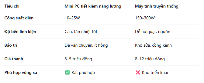 Kết nối tri thức tới vùng xa bằng Mini PC tiết kiệm năng lượng View Larger Image 🌄 1. Vùng xa – nơi công nghệ cần sự thích nghi và tiết kiệmỞ các vùng sâu vùng xa, điện yếu, mạng Internet chập chờn và điều kiện bảo trì khó khăn khiến việc phổ cập công nghệ gặp nhiều thách thức.Trong khi máy tính truyền thống cồng kềnh, tiêu thụ điện cao, và dễ hỏng trong môi trường ẩm thấp, thì Mini PC tiết kiệm năng lượng xuất hiện như một giải pháp toàn diện, mang tri thức và công nghệ đến gần hơn với mọi người dân, học sinh và cán bộ vùng xa. Mini PC không chỉ giúp truy cập thông tin, học tập, làm việc mà còn góp phần thu hẹp khoảng cách số hóa giữa thành thị và nông thôn, giữa vùng trung tâm và vùng khó khăn. ⚙️ 2. Mini PC tiết kiệm năng lượng là gì?Mini PC tiết kiệm năng lượng là máy tính thu nhỏ có khả năng vận hành mạnh mẽ nhưng tiêu thụ điện cực thấp – chỉ từ 10–25W, bằng 1/10 so với máy tính để bàn thông thường.Bên trong, mini PC vẫn có đầy đủ: CPU hiệu năng cao như Intel N100, N5105, Ryzen Embedded. RAM 8–16GB, ổ SSD tốc độ cao. Cổng kết nối đa dạng: USB, HDMI, LAN, Wi-Fi, Bluetooth. Điều này giúp mini PC có thể đảm nhiệm hầu hết các công việc giáo dục, hành chính, y tế và doanh nghiệp trong khi tiết kiệm năng lượng, giảm chi phí điện, và hoạt động ổn định suốt nhiều năm. Your Content Goes Here💡 3. Lợi ích nổi bật của Mini PC cho vùng xa🔋 Tiết kiệm năng lượng – phù hợp với điều kiện điện yếu Mini PC chỉ tiêu thụ khoảng 10–25W, tương đương một bóng đèn LED, có thể chạy ổn định ngay cả khi dùng điện năng lượng mặt trời – giải pháp lý tưởng cho các xã vùng cao, đảo xa hoặc khu vực chưa có điện ổn định. 🧱 Bền bỉ – ít hỏng hóc trong môi trường khắc nghiệt Vỏ hợp kim nhôm nguyên khối, tản nhiệt thụ động không quạt, giúp mini PC chống bụi, chống ẩm, vận hành êm ái suốt 24/7. 💻 Hiệu năng ổn định – phục vụ mọi tác vụ Mini PC tiết kiệm năng lượng vẫn đủ mạnh để chạy: Windows 10/11, Office, trình duyệt, phần mềm hành chính. Các hệ thống quản lý y tế, học tập trực tuyến, phần mềm kế toán. Kết nối thiết bị như máy in, máy quét mã vạch, camera, màn hình lớn. Intel NUC – Mini PC hiệu năng cao, tiết kiệm điện năng 🌱 Thân thiện với môi trường Nhờ tiêu thụ điện thấp và tỏa nhiệt ít, mini PC góp phần giảm phát thải CO₂, là lựa chọn bền vững cho các chương trình “xanh hóa công nghệ”. 🏫 4. Ứng dụng thực tế của Mini PC trong vùng sâu vùng xa1. Giáo dục: Dùng làm máy học cho học sinh, giúp tiếp cận Internet và tài liệu số. Cài phần mềm học trực tuyến như Zoom, Teams, Google Classroom. Giúp giáo viên soạn bài, trình chiếu và lưu trữ tài liệu giảng dạy. 2. Cơ quan hành chính xã, huyện: Hỗ trợ xử lý hồ sơ, chữ ký số, tra cứu dân cư, và kết nối hệ thống chính phủ điện tử. Tiết kiệm điện năng khi vận hành liên tục trong giờ hành chính. 3. Trạm y tế vùng cao: Ghi nhận hồ sơ khám bệnh, in hóa đơn, kết nối thiết bị đo huyết áp, siêu âm. Chạy phần mềm quản lý bệnh nhân nhẹ nhàng, ổn định. 4. Tổ chức xã hội và doanh nghiệp: Tặng Mini PC cho trường học hoặc cơ sở y tế vùng xa là một hình thức thiện nguyện thiết thực, mang giá trị lâu dài. UNESCO – Digital Learning for Remote Areas ⚡ 5. Vì sao Mini PC là cầu nối tri thức vùng xa?Mini PC không chỉ là thiết bị tiết kiệm điện, mà còn là cầu nối giúp người dân vùng xa tiếp cận Internet, học tập, y tế và hành chính số hóa. 🧭 6. Hướng tới tương lai số bền vững Khi nói đến chuyển đổi số quốc gia, không thể bỏ quên vùng sâu vùng xa. Việc triển khai Mini PC – Máy tính công nghiệp tiết kiệm năng lượng tại các khu vực này không chỉ mang tính kinh tế mà còn góp phần vào bình đẳng tri thức và phát triển bền vững. Mỗi chiếc Mini PC là một hạt mầm công nghệ – nhỏ bé, khiêm tốn, nhưng có thể gieo nên những thay đổi lớn cho cả cộng đồng. Mini PC – Máy Tính Công Nghiệp IPC AI PC – Máy tính AI Intel F1A | Intel Ultra 7 155H 10.500.000₫ Thêm vào giỏ hàng Details AI PC – Máy tính AI Intel F2A | Intel Ultra 7 155H 10.500.000₫ Thêm vào giỏ hàng Details Sale! Máy All In One cho văn phòng – PC Gaming – INTEL i5 12450H 8 lõi 12 luồng 14.500.000₫ Giá gốc là: 14.500.000₫.13.950.000₫Giá hiện tại là: 13.950.000₫. Thêm vào giỏ hàng Details Máy all in one giá rẻ – PC Gaming – INTEL I5 10500H 6 lõi 12 luồng 13.700.000₫ Thêm vào giỏ hàng Details Máy tính AI – AI PC | Intel I9-12900H + Nvidia RTX3080 28.500.000₫ Thêm vào giỏ hàng Details Máy tính AI AMD AM18 | Ryzen 7 8845HS + Radeon 780M 14.500.000₫ Thêm vào giỏ hàng Details Máy tính AI PC M1A | Intel I9-13900H + Nvidia RTX-3080 26.000.000₫ Thêm vào giỏ hàng Details Máy tính All In One Optori G40 Pro – PC Gaming – INTEL i5 12450H 14.500.000₫ Thêm vào giỏ hàng Details Bán Hàng POS – Bảng Giá Điện TửMáy quét mã vạchMáy kiểm khoElectronic Shelf Label admin2025-10-15T14:43:01+07:00 Related Posts Doanh nghiệp chung tay vì vùng s
