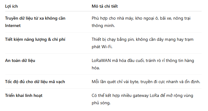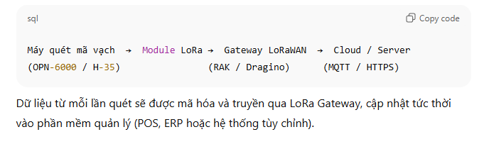 Máy quét mã vạch kết nối LoRa / LoRaWAN View Larger Image 1️⃣ LoRa / LoRaWAN là gì?LoRa (Long Range) là công nghệ truyền thông không dây tầm xa, tiêu thụ năng lượng cực thấp, phù hợp cho các thiết bị IoT.LoRaWAN là giao thức mạng mở rộng dựa trên LoRa, cho phép thiết bị gửi dữ liệu qua các gateway trung gian đến server đám mây mà không cần Internet trực tiếp. Điểm mạnh nổi bật: 📶 Phạm vi truyền 2–15 km (tuỳ địa hình) 🔋 Tiêu thụ điện năng thấp, hoạt động bằng pin trong nhiều ngày 🌐 Không phụ thuộc Wi-Fi hay 4G 🔐 Hỗ trợ mã hóa dữ liệu (AES 128-bit) đảm bảo an toàn 2️⃣ Khi công nghệ LoRa gặp thiết bị quét mã vạchThông thường, máy quét mã vạch cần Bluetooth, Wi-Fi hoặc USB để truyền dữ liệu.Nhưng trong môi trường: Kho lạnh, nhà xưởng rộng, hầm ngầm, khu vực nông nghiệp, hoặc nơi không có mạng ổn định Các trạm kiểm hàng, bãi container, hoặc nơi nhân viên di chuyển liên tục ➡️ Giải pháp “máy quét mã vạch kết nối LoRa / LoRaWAN” trở thành lựa chọn tối ưu.Dữ liệu quét từ thiết bị sẽ được mã hóa và gửi qua gateway LoRa về máy chủ trung tâm hoặc đám mây (cloud) để xử lý ngay lập tức. 3️⃣ Lợi ích nổi bật của giải pháp4️⃣ Đề xuất thiết bị phù hợp từ Opticon 🔹 OPN-6000 – Máy quét mã vạch Bluetooth 5.4 Nhỏ gọn, nặng chỉ 52 g, pin 4 ngày (1000 lượt quét/ngày). Tương thích với module chuyển đổi Bluetooth–LoRa (như RAK, Dragino, Seeed Studio). Khi kết hợp, dữ liệu quét từ OPN-6000 được gửi qua LoRa gateway lên server trung tâm. Ứng dụng lý tưởng: kho bãi ngoài trời, nông nghiệp thông minh, trạm hậu cần vùng sâu. 🔹 H-35 Android Mobile Computer Chạy Android 11, CPU Qualcomm 2.0 GHz, màn hình Gorilla Glass 5.5″. Hỗ trợ USB/NFC/Bluetooth/Wi-Fi, có thể tích hợp mô-đun LoRa qua USB-C hoặc UART. Chuẩn IP65, chịu rơi 2.4 m, lý tưởng cho môi trường công nghiệp khắc nghiệt. Khi cài ứng dụng LoRaWAN client, H-35 có thể trở thành thiết bị IoT di động có khả năng quét & truyền dữ liệu từ xa. 5️⃣ Ứng dụng thực tế6️⃣ Hệ thống hoạt động (Sơ đồ mô tả)7️⃣ Câu chuyện thực tế: Dự án kiểm kho ngoài trời tại khu công nghiệp VSIP Bình DươngCông ty LogisTech Việt Nam, chuyên vận hành kho trung chuyển container, từng gặp vấn đề lớn: Mạng Wi-Fi không phủ hết bãi hàng rộng 3 ha. Dữ liệu quét từ mã container bị chậm hoặc mất kết nối. Sau khi triển khai hệ thống OPN-6000 kết hợp module LoRa RAK4600, kết nối qua LoRaWAN gateway Mikrotik Lora8, toàn bộ dữ liệu quét được đồng bộ về server nội bộ qua MQTT với độ trễ chỉ 1–2 giây.Kết quả: Năng suất tăng 35%, Nhân viên không cần quay về văn phòng nhập dữ liệu thủ công, Pin máy quét dùng được 4 ngày liên tục mà không cần sạc. Giải pháp này hiện được mở rộng cho cả trạm giao nhận ở Long An và Tây Ninh, chứng minh tính ứng dụng thực tiễn của LoRa trong quản lý chuỗi cung ứng. 8️⃣ Kết luậnGiải pháp máy quét mã vạch kết nối LoRa / LoRaWAN mở ra hướng đi mới cho các doanh nghiệp cần truyền dữ liệu ở khu vực rộng, hạ tầng yếu hoặc yêu cầu tính ổn định cao.Kết hợp cùng các thiết bị quét của Opticon – thương hiệu Nhật Bản uy tín hơn 45 năm, bạn có thể xây dựng một hệ thống quét – truyền – quản lý dữ liệu toàn diện và tiết kiệm. LoRa Alliance – Official LoRaWAN Standard Organization – Tổ chức quốc tế định nghĩa tiêu chuẩn LoRaWAN. The Things Network – Cộng đồng mã nguồn mở lớn nhất thế giới về LoRaWAN và IoT. Top 10 Máy Quét Mã Vạch Năm 2025 Hướng dẫn cài đặt sử dụng SDK Zebra TC27 SE4710 15.500.000₫ Thêm vào giỏ hàng Details Máy đọc căn cước công dân – Máy quét mã vạch – Opticon PR11 5.450.000₫ Thêm vào giỏ hàng Details Máy đọc mã vạch 2D Zebra DS2208 – Dòng DS2200 1.850.000₫ Thêm vào giỏ hàng Details Máy đọc mã vạch không dây – Zebra DS8178 7.200.000₫ Thêm vào giỏ hàng Details Máy đọc thẻ CCCD – Máy quét mã vạch Opticon L-210 1.950.000₫ Thêm vào giỏ hàng Details Máy đọc thẻ CCCD – Máy quét mã vạch Opticon L46X 3.150.000₫ Thêm vào giỏ hàng Details Máy kiểm kê di động – Máy PDA Optori OP695 12.500.000₫ Thêm vào giỏ hàng Details Sale! Máy kiểm kê hàng hóa – OPTORI M10 4.500.000₫ Giá gốc là: 4.500.000₫.3.850.000₫Giá hiện tại là: 3.850.000₫. Thêm vào giỏ hàng Details Danh mục máy quét mã vạchDÒNG MÁY CÓ DÂYDÒNG MÁY KHÔNG DÂYDÒNG MÁY KIỂM KHO PDADÒNG MÁY FITMOUNT admin2025-10-22T12:07:20+07:00 Related Posts Máy quét mã vạch kết nối RF 433 MHz | RF 315MHz Máy quét mã vạch kết nối RF 433 MHz | RF 315MHz Tháng 10 22nd, 2025 Máy quét mã vạch kết nối Zigbee Thread Máy quét mã vạch kết nối Zigbee Thread Tháng 10 22nd, 2025 Thiết bị đọc mã vạch Thiết bị đọc mã vạch Tháng 10 22nd, 2025 Quét mã vạch Quét mã vạch Tháng 10 21st, 2025 Máy quét mã vạch Máy quét mã vạch Tháng 10 21st, 2025