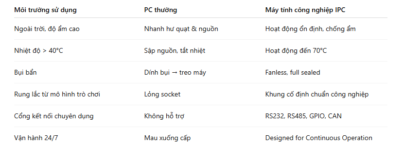 Máy tính công nghiệp IPC cho Suối Tiên – Bà Nà Hill – Đầm Sen View Larger Image Trong các khu du lịch như Suối Tiên, Bà Nà Hill, Đầm Sen hay các khu giải trí ngoài trời, môi trường vận hành thiết bị điện tử luôn là một thách thức: nhiệt độ cao, độ ẩm lớn, mưa nắng thất thường, bụi bẩn, tia UV, nhiễu tín hiệu, rung lắc từ hệ thống mô phỏng và các thiết bị động. Vì vậy, các thiết bị công nghệ thông thường như PC văn phòng hay máy tính dân dụng gần như không thể đáp ứng, dễ hư hỏng, mất dữ liệu hoặc dừng hoạt động giữa giờ. I. Giới thiệu về Máy tính công nghiệp IPC cho khu du lịchTrong vòng 5 – 10 năm trở lại đây, các mô hình giải trí ngoài trời đang dần chuyển đổi số, áp dụng các công nghệ vận hành mới: ✔ Soát vé tự động – self-check-in✔ Kiosk thanh toán – QR Payment✔ Hệ thống POS bán vé & dịch vụ kết hợp với máy quét mã vạch công nghiệp✔ Quản lý hàng hóa & kho tại quầy✔ Camera phân tích hành vi du khách✔ Hệ thống e-tag e-paper✔ Thiết bị cảm biến IoT giám sát môi trường✔ Điều khiển tự động băng chuyền, cáp treo✔ Thiết bị điều khiển trò chơi mô hình động Nếu như PC thông thường cần bảo trì liên tục, thay quạt tản nhiệt, vệ sinh bụi, thay nguồn, thay ổ cứng, thì IPC gần như zero bảo trì nhờ: ► Thiết kế không quạt – tản nhiệt khối nhôm Không động cơ quay → không bụi → không kẹt quạt. ► PCB công nghiệp – tuổi thọ cao gấp 3–5 lần PC dân dụng Mạch chống nhiễu, chống ẩm, linh kiện class A. ► Chống rung và chống ẩm Phù hợp môi trường cáp treo, khu trò chơi chuyển động. ► Công nghệ lưu trữ SSD chống shock Không vỡ đầu đọc, không mất dữ liệu. ► Công suất tiêu thụ thấp Tiết kiệm điện cho hệ thống hàng trăm thiết bị. II. Vì sao khu du lịch ngoài trời cần IPC, không thể dùng PC văn phòng?Chủ khu du lịch càng mở rộng hạ tầng → càng cần IPC để đảm bảo: ✔ Giảm downtime hệ thống✔ Giảm chi phí bảo trì✔ Tăng trải nghiệm khách hàng✔ Tăng tính tự động hóa III. Những tính năng nổi bật của Máy tính công nghiệp IPC1. Thiết kế fanless – chống bụi tuyệt đối Khung tản nhiệt dạng heat sink Không quạt → không hút bụi Phù hợp kiosk đặt ngoài trời 2. Vận hành 24/7 – tuổi thọ đến 10 năm IPC hỗ trợ công nghệ: Wide-range Power input→ Điện dao động vẫn chạy ổn định→ Giảm số lần hư nguồn Mainboard công nghiệp→ 4000 giờ burn-test 3. Hỗ trợ nhiều cổng giao tiếp đặc thù ✔ COM RS232/485 cho hệ thống soát vé✔ LAN kép cho thiết bị Internet dự phòng✔ USB tốc độ cao cho kiosk✔ HDMI/DP cho màn hình lớn ngoài trời✔ GPIO kết nối cảm biến 4. Khả năng chống sốc rung Phù hợp lắp trong: Cabin cáp treo Hệ thống cơ khí chuyển động Mô hình tàu lượn siêu tốc 5. Khả năng mở rộng linh hoạt Khách hàng có thể cấu hình: ☑ RAM từ 8GB – 32GB☑ SSD NVMe chống shock☑ Quạt phụ nếu lắp trong hộp kín☑ Module 4G/5G☑ Module WiFi Dual-band IV. Ứng dụng IPC trong thực tế tại các khu du lịch Việt Nam1. Khu du lịch Suối Tiên IPC được sử dụng tại: Kiosk check-in cổng chính Quầy POS bán vé dịch vụ Hệ thống camera phân tích lưu lượng khách Màn hình LED 65–86 inch hiển thị giá vé IPC giúp giảm thời gian xử lý vé xuống chỉ còn 2 giây, thay vì quét thủ công. 2. Đầm Sen Waterpark Môi trường độ ẩm cao → IPC đặc biệt hiệu quả Ứng dụng: ✔ Quản lý tủ đồ gửi khách✔ Bảng giá dịch vụ điện tử✔ Hệ thống gọi món nhanh IPC được đặt ngay sát khu vực phun nước, hoạt động ổn định > 24 tháng. 3. Bà Nà Hills Đây là nơi IPC phát huy tối đa tính chống rung và chống ẩm. Ứng dụng gồm: Truyền dữ liệu cho cáp treo Quản lý quầy bán hàng Xử lý thông tin du lịch thông minh Điều khiển hệ thống kiosk cảm ứng Tại khu vực cầu Vàng – môi trường lạnh, độ ẩm cao, IPC vẫn vận hành trơn tru. V. Câu chuyện thực tếNăm 2024, một chủ đầu tư tại Bà Nà Hill triển khai 58 kiosk bán vé tự động dùng máy văn phòng truyền thống. Sau 6 tháng hoạt động: ❌ 21 máy hư quạt❌ 12 ổ HDD lỗi❌ 5 trường hợp treo máy trong giờ cao điểm❌ chi phí bảo trì mỗi tháng lên tới 18–20 triệu Khách phàn nàn vì đứng chờ, nhân viên phải reset thủ công. Cuối năm 2024, hệ thống chuyển đổi sang IPC fanless: ► 0 bảo trì trong 9 tháng► Không còn trường hợp treo máy► Nhiệt độ CPU giảm 18°C► Điện năng giảm 37% Kết quả cuối cùng: ✔ Chi phí bảo trì giảm gần 90%✔ Hệ thống chạy ổn định xuyên Tết✔ Tăng tốc quy trình tự động hóa và doanh thu bán vé Chủ đầu tư nhận định: “IPC giúp hệ thống luôn chạy ổn định dù du khách đông hay thời tiết thay đổi. Chúng tôi đã tiết kiệm rất nhiều thời gian, nhân lực và chi phí vận hành.” VI. Tại sao chủ khu du lịch nên chuyển sang IPC ngay? ⭐ Hệ thống chạy không gián đoạn⭐ Tối ưu chi phí tổng (TCO)⭐ Tăng trải nghiệm khách hàng⭐ Giảm phụ thuộc nhân viên vận hành⭐ Tăng năng suất check-in & thanh toán Đặc biệt phù hợp khi: ✔ Hệ thố