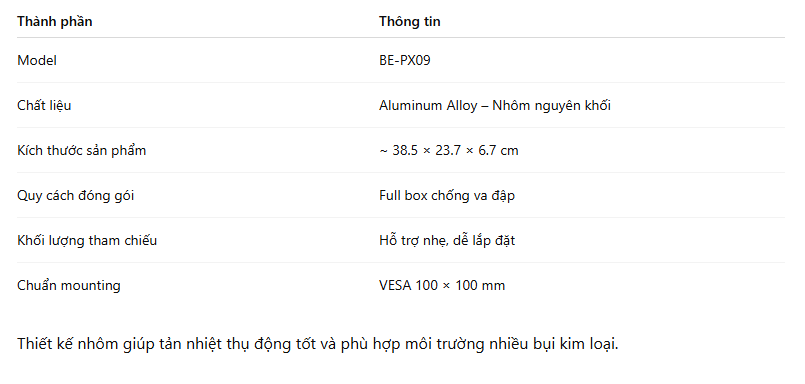 Với màn hình 15.6” Full HD chất lượng hiển thị cao, CPU Intel hiệu suất ổn định, khả năng mở rộng bộ nhớ linh hoạt và nhiều cổng I/O chuyên dụng, BE-PX09 trở thành lựa chọn hàng đầu khi doanh nghiệp cần thiết bị vận hành ổn định 24/7.