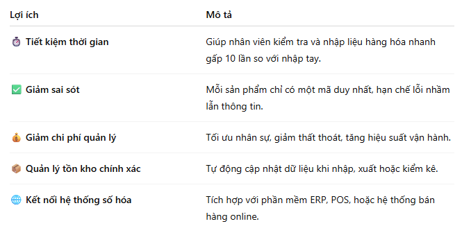 Quét mã vạch View Larger Image 🧩 Quét mã vạch là gì?Quét mã vạch (tiếng Anh: Barcode Scanning) là quá trình sử dụng thiết bị đọc mã vạch (barcode scanner) để thu nhận dữ liệu từ các mã gồm những đường kẻ song song hoặc ký tự mã hóa. Thông tin này sau đó được chuyển thành dữ liệu kỹ thuật số phục vụ cho các hệ thống quản lý hàng hóa, kho vận, y tế hay bán lẻ. Mỗi mã vạch thường chứa thông tin như: Mã sản phẩm (SKU, UPC, EAN) Ngày sản xuất, hạn sử dụng Thông tin lô hàng, đơn vị cung cấp Giá bán hoặc dữ liệu quản trị khác Công nghệ quét mã vạch ngày nay không chỉ dừng lại ở mã 1D (đường kẻ) mà còn mở rộng sang mã 2D (QR Code, DataMatrix, PDF417…) giúp chứa nhiều thông tin hơn. ⚙️ Nguyên lý hoạt động của quét mã vạchKhi người dùng chiếu tia laser hoặc cảm biến hình ảnh lên mã vạch, thiết bị sẽ thu nhận phản xạ ánh sáng hoặc hình ảnh của các vạch đen – trắng.Sau đó: Bộ xử lý trong máy quét chuyển tín hiệu quang thành tín hiệu điện tử. Dữ liệu được giải mã thành chuỗi ký tự (ví dụ: “8938505972109”). Máy tính hoặc phần mềm POS nhận chuỗi đó để hiển thị thông tin sản phẩm, giá, tồn kho,… Công nghệ này có thể thực hiện qua: Máy quét mã vạch laser (Laser scanner) Máy quét ảnh CMOS/CCD (Image-based scanner) Thiết bị cầm tay không dây Bluetooth hoặc Wi-Fi Camera AI hoặc smartphone tích hợp chức năng quét mã 💡 Lợi ích của việc quét mã vạch trong doanh nghiệp🏭 Ứng dụng của công nghệ quét mã vạch1️⃣ Trong bán lẻ và siêu thị Máy quét mã vạch giúp thu ngân kiểm tra giá và thanh toán nhanh chóng, đồng thời hỗ trợ kiểm kê kho, đổi trả và báo cáo tồn kho tự động. 2️⃣ Trong y tế và bệnh viện Mỗi bệnh nhân, mẫu xét nghiệm hay thuốc đều có mã riêng. Việc quét mã vạch giúp tránh nhầm thuốc, quản lý bệnh án và thời gian khám chữa bệnh hiệu quả hơn.👉 Tham khảo thêm giải pháp E-Tag bệnh viện thông minh của Optori (liên kết nội bộ có thể đặt sau). 3️⃣ Trong sản xuất và logistics Theo dõi từng công đoạn sản xuất, vị trí hàng hóa trong kho, vận chuyển và truy xuất nguồn gốc sản phẩm. 4️⃣ Trong giáo dục và hành chính Quản lý tài sản, điểm danh học sinh, hoặc theo dõi hồ sơ công dân đều có thể áp dụng công nghệ mã vạch. 🧠 Xu hướng mới: Quét mã vạch bằng AI và thiết bị di độngCông nghệ AI Barcode Recognition đang giúp doanh nghiệp nhận diện mã vạch ngay cả khi bị mờ, méo hoặc in sai lệch.Các ứng dụng trên smartphone hoặc tablet có thể thay thế máy quét truyền thống nhờ camera độ phân giải cao, giúp tiết kiệm chi phí đầu tư ban đầu. Đặc biệt, các giải pháp E-Tag – ESL (Electronic Shelf Label) đang mở ra xu hướng quản lý thông minh bằng mã vạch và QR code, tự động đồng bộ giá, tồn kho và hiển thị thông tin sản phẩm theo thời gian thực. 🔗 Nguồn tham khảo uy tín GS1 – Hệ thống tiêu chuẩn mã vạch toàn cầu Barcodenews.com – Trang chuyên ngành mã vạch quốc tế ✳️ Kết luậnQuét mã vạch là nền tảng cốt lõi cho mọi hệ thống quản lý hiện đại – từ siêu thị, nhà máy đến bệnh viện. Việc ứng dụng công nghệ quét mã vạch không chỉ giúp tăng tốc độ xử lý thông tin mà còn tạo nên một chuỗi quản trị thông minh, minh bạch và đáng tin cậy trong thời đại chuyển đổi số. Hướng dẫn Download và sử dụngTài liệu HDSD.docxVideo hướng dẫnĐăng ký tài khoản miễn phí tại soundtag.optorobot.comDownload phần mềm Sound-Tag cho HĐH Windows Top 10 Máy Quét Mã Vạch Năm 2025 Hướng dẫn cài đặt sử dụng SDK Zebra TC27 SE4710 15.500.000₫ Thêm vào giỏ hàng Details Máy đọc căn cước công dân – Máy quét mã vạch – Opticon PR11 5.450.000₫ Thêm vào giỏ hàng Details Máy đọc mã vạch 2D Zebra DS2208 – Dòng DS2200 1.850.000₫ Thêm vào giỏ hàng Details Máy đọc mã vạch không dây – Zebra DS8178 7.200.000₫ Thêm vào giỏ hàng Details Máy đọc thẻ CCCD – Máy quét mã vạch Opticon L-210 1.950.000₫ Thêm vào giỏ hàng Details Máy đọc thẻ CCCD – Máy quét mã vạch Opticon L46X 3.150.000₫ Thêm vào giỏ hàng Details Máy kiểm kê di động – Máy PDA Optori OP695 12.500.000₫ Thêm vào giỏ hàng Details Sale! Máy kiểm kê hàng hóa – OPTORI M10 4.500.000₫ Giá gốc là: 4.500.000₫.3.850.000₫Giá hiện tại là: 3.850.000₫. Thêm vào giỏ hàng Details Danh mục máy quét mã vạchDÒNG MÁY CÓ DÂYDÒNG MÁY KHÔNG DÂYDÒNG MÁY KIỂM KHO PDADÒNG MÁY FITMOUNT admin2025-10-21T14:55:28+07:00 Related Posts Máy quét mã vạch Máy quét mã vạch Tháng 10 21st, 2025 Phần mềm check-in miễn phí bằng mã vạch – Hỗ trợ CCCD & Passport Phần mềm check-in miễn phí bằng mã vạch – Hỗ trợ CCCD & Passport Tháng 10 10th, 2025 Hệ thống check-in khu vui chơi, công viên bằng mã vạch nhanh chóng Hệ thống check-in khu vui chơi, công viên bằng mã vạch nhanh chóng Tháng 10 10th, 2025 Ứng dụng check-in điểm du lịch tâm linh – Hỗ trợ mã QR trên căn cước Ứng dụng check-in điểm du lịch tâm linh – Hỗ trợ mã QR trên căn cước Tháng 10 10th, 2025 Không cần hỏi nhân viên: Quét mã vạch để biết giá & sả